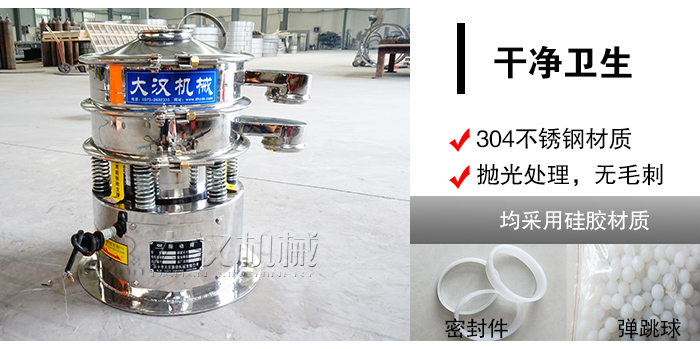 中西藥顆粒屬于醫藥行業,對于衛生要求十分嚴格,大漢旋振篩精選304不銹鋼材質,密封件和彈跳球清網裝置均采用硅膠材質,另外篩機內外經過拋光處理,無毛刺現象,符合醫藥衛生標準。