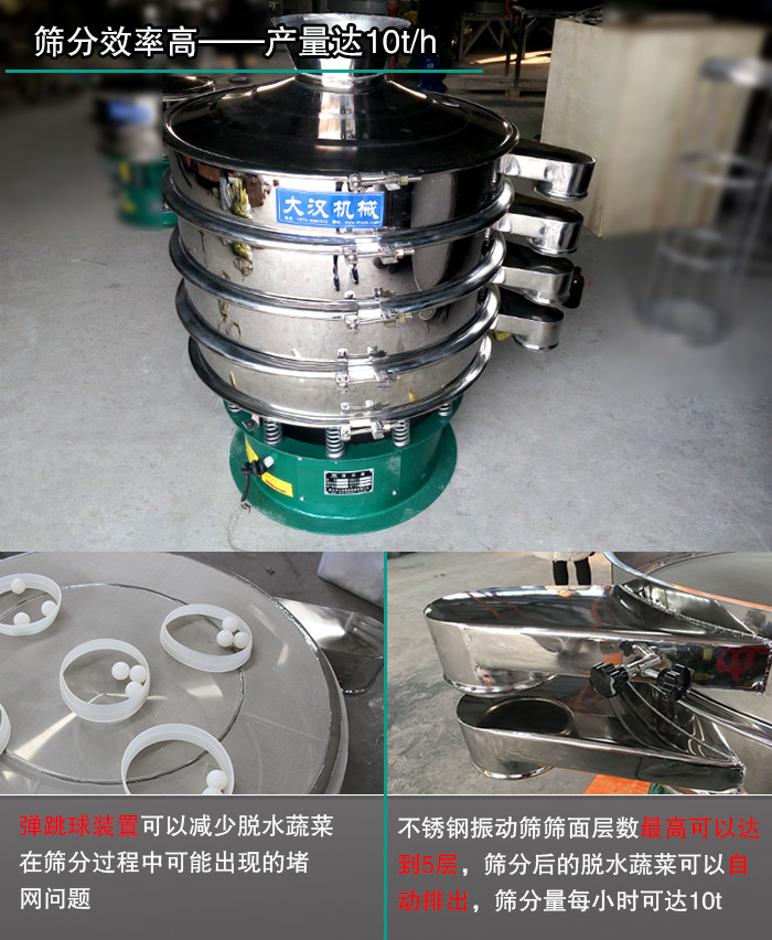 脫水蔬菜振動篩配置有彈跳球裝置,可以減少脫水蔬菜在篩分過程中可能出現的堵網問題,而且不銹鋼振動篩篩面層數高可以達到5層,雜質、粗料可以自動排出,篩分量大。